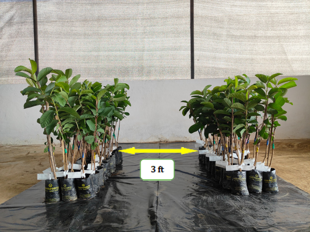 पॉलिथीन पर 10 -10 पौधे को लाइन में रखें एवं एक लाइन से दूसरी लाइन कम से कम 3 फ़ीट से 4 फीट दूर रखें, जिसे सिंचाई एवं स्प्रे करने में सुविधा हो