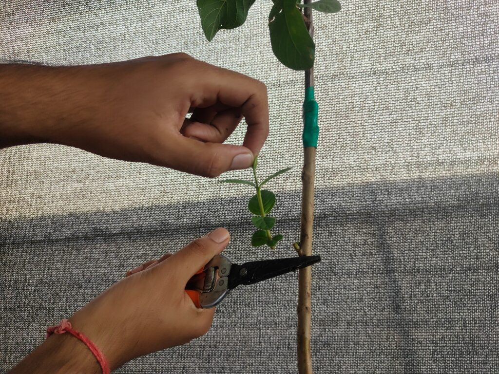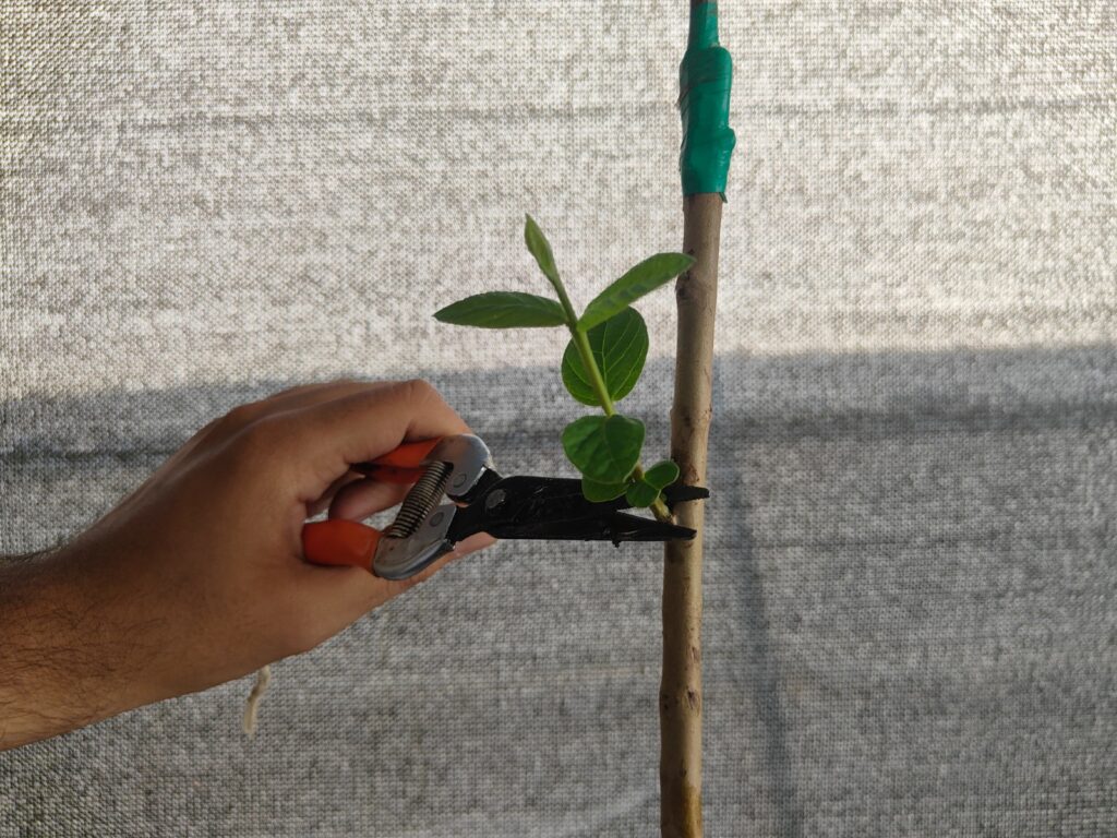 ग्राफ्टिंग/बडिंग जोड़ के नीचे वानस्पतिक वृद्धि को हटाना