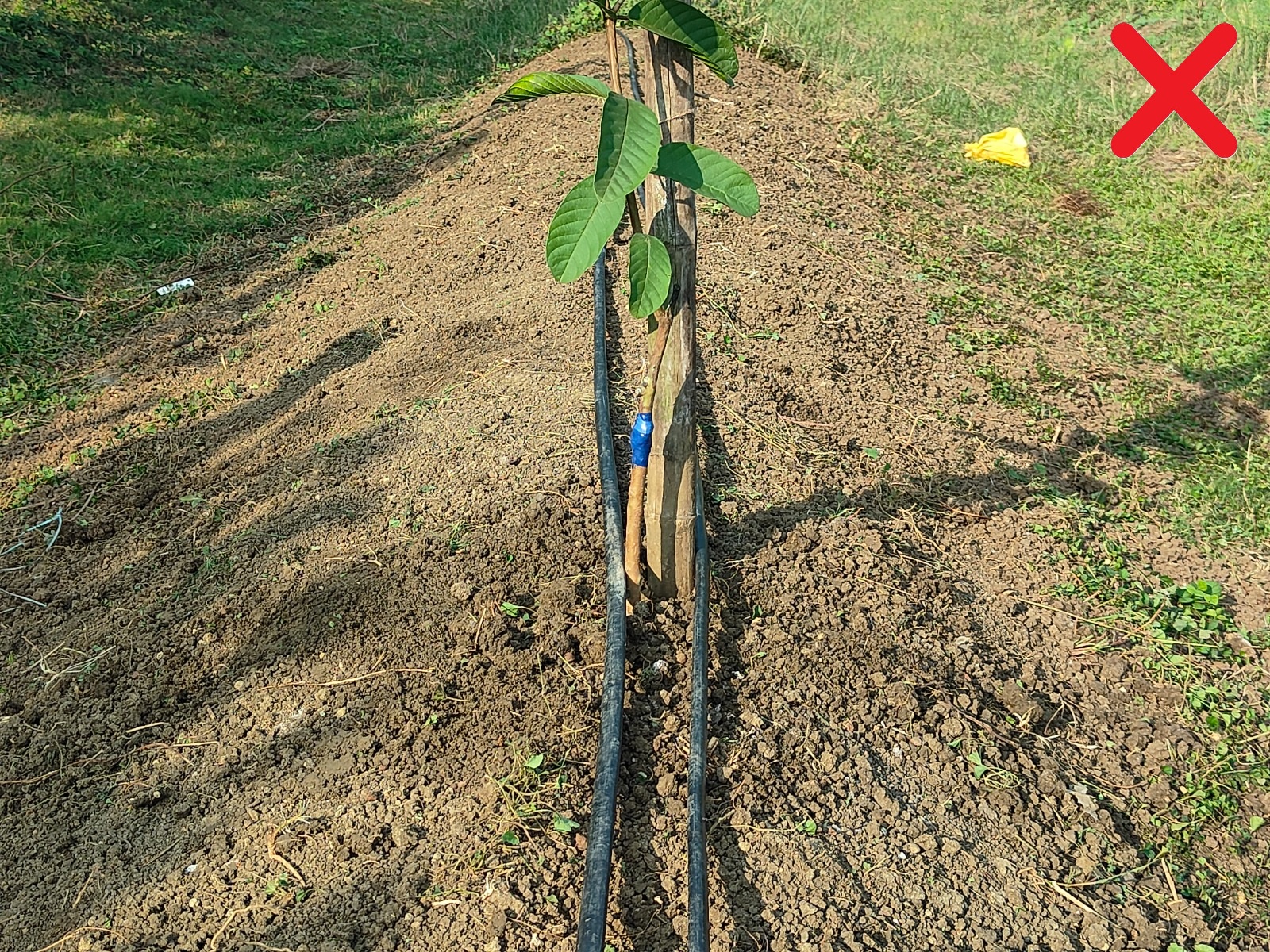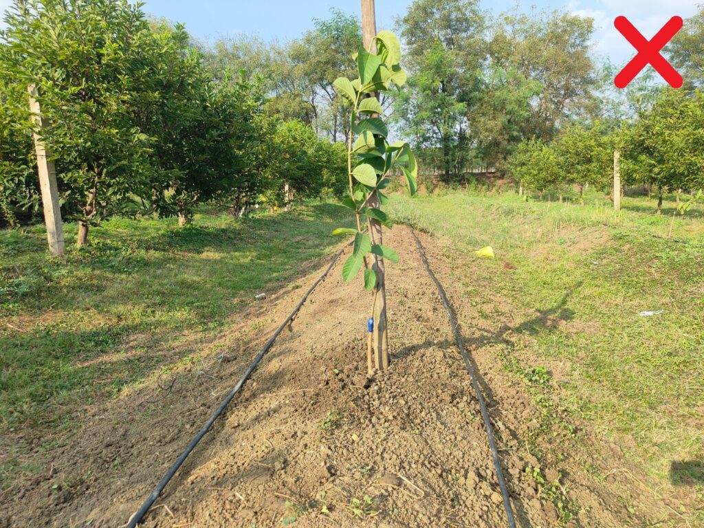 पौधरोपण के पश्चात कभी भी ड्रिप लाइन को पौधे के तने के अत्यधिक नजदीक / सटाकर ना रखें अथवा अथवा तने से न बाँधे इससे तने में  कॉलर रॉट नामक बीमारी होने की संभावना रहती है|