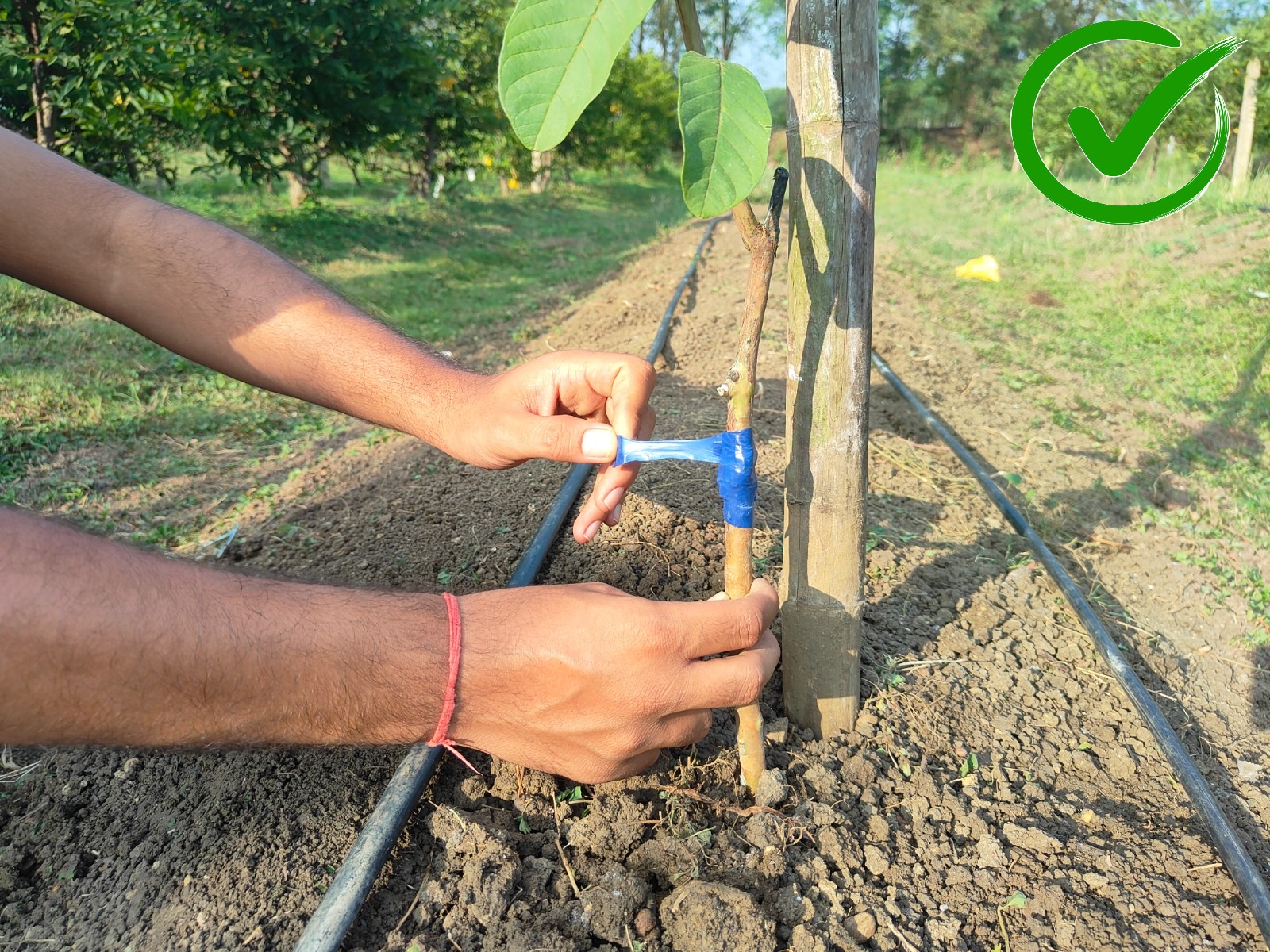 वी एन आर अमरूद बीही के पौधों से ग्राफ्टिंग जोड़ से टेप निकालना