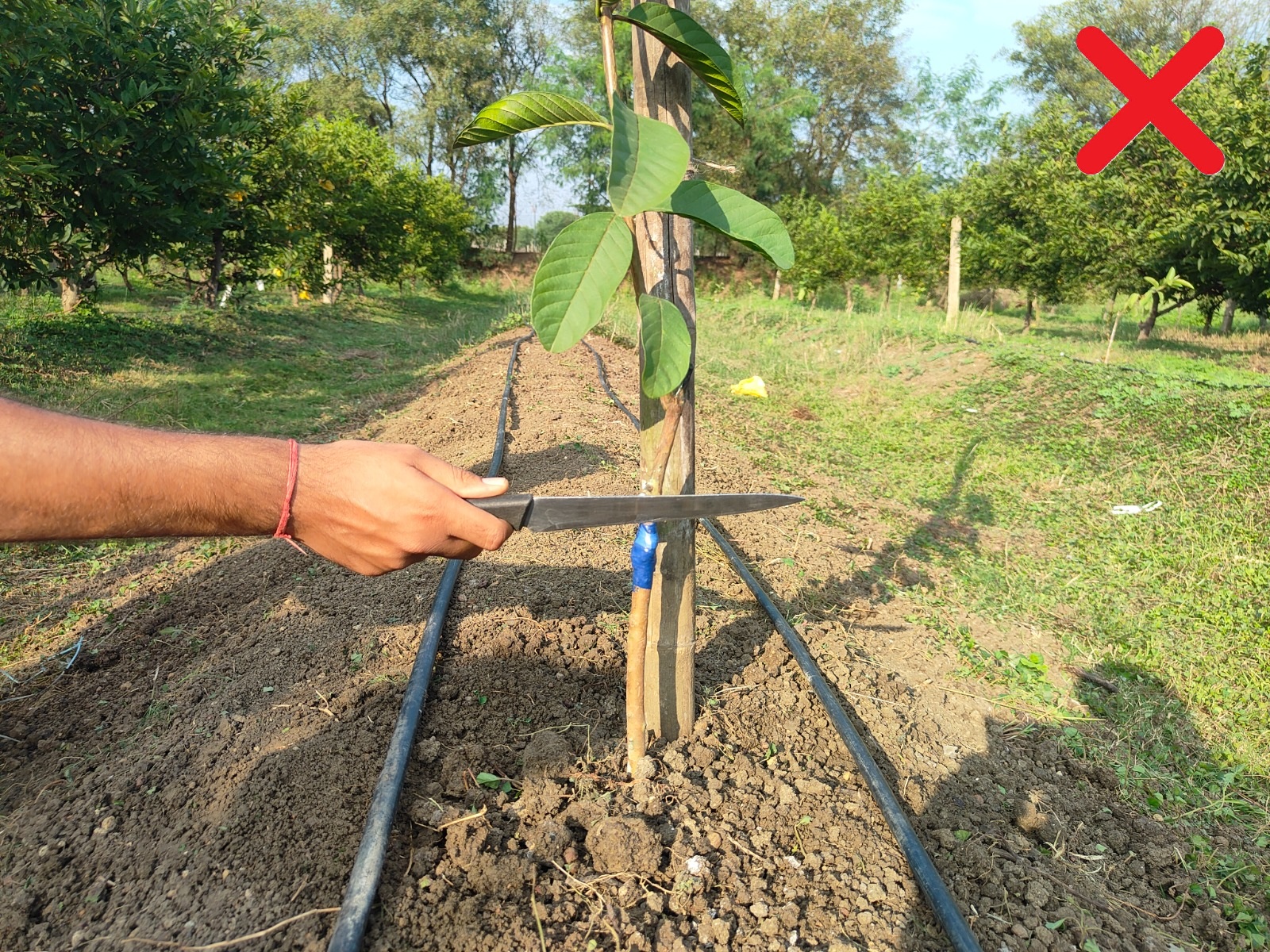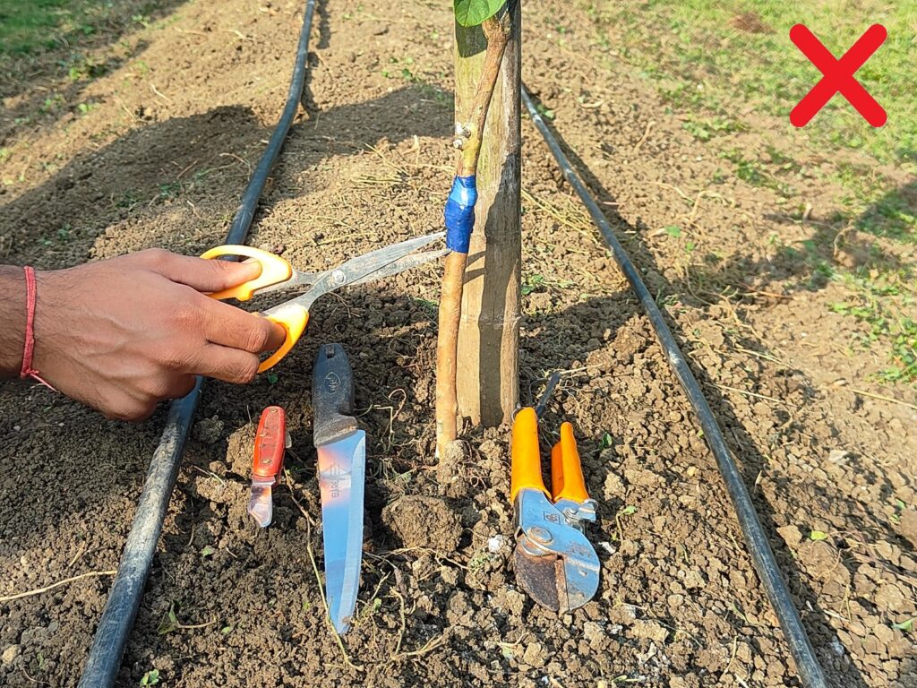 किसी भी धारदार वस्तु जैसे चाकू ,कैची के प्रयोग से बचें यह पौधे के तने को एवं ग्राफ्टिंग जोड़ को नुकसान पहुंचा सकता है|